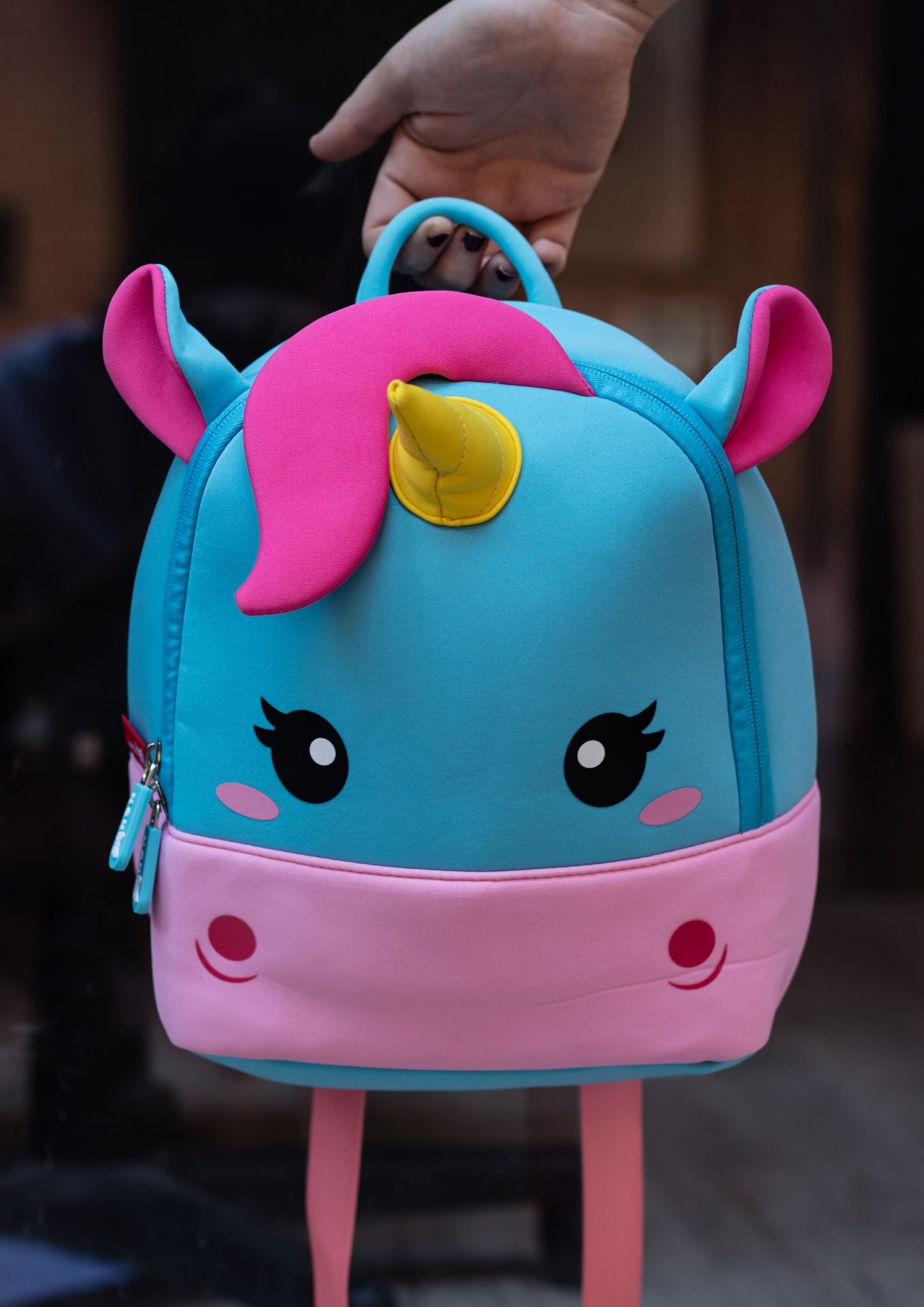Mochila de neopreno con forma de unicornio. Totalmente ergonómica gracias a su material y a las correas ajustables que permiten adaptar la mochila a las necesidades y estatura de su hijo/a.